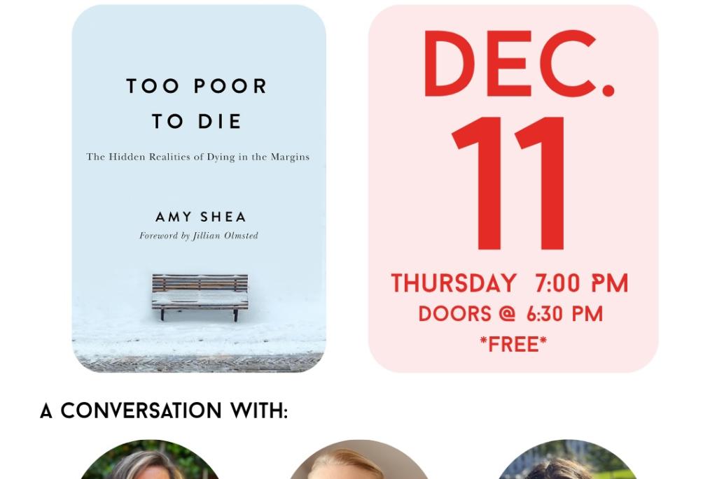 Arts + Literature Laboratory and Madison Death Studio welcomes Amy Shea for a discussion of her book, Too Poor to Die: The Hidden Realities of Dying in the Margins, on Thursday, December 11, 7:00pm. Free admission.