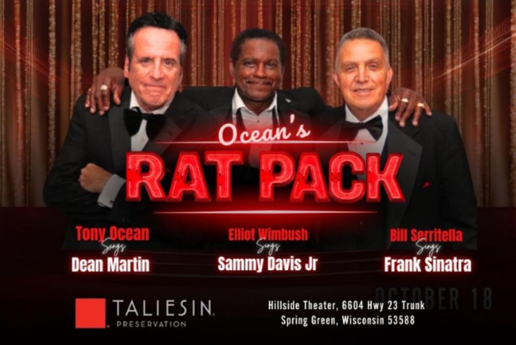 Ocean's Rat Pack is the ultimate tribute group devoted to the music of Dean Martin by Tony Ocean, Frank Sinatra by Bill Serritella and Sammy Davis Jr. performed by Elliot Wimbush. Ocean's Rat Pack brings the audience back in time when Vegas and Hollywood was king. Delight in their authentic performances that bring to life the vibe of the Rat Pack era and proving that these classics will never go out of style, but rather create new fans of the legendary performers of the Rat Pack. Doors open at 6:00 PM with the concert starting promptly at 6:30 PM. Add to your concert experience! VIP tickets include a pre-show meet-and-greet wine and cheese reception with the artists in the Taliesin living room from 5:00-6:00pm, as well as reserved priority concert seating at the Hillside Theater. Limited spots available!