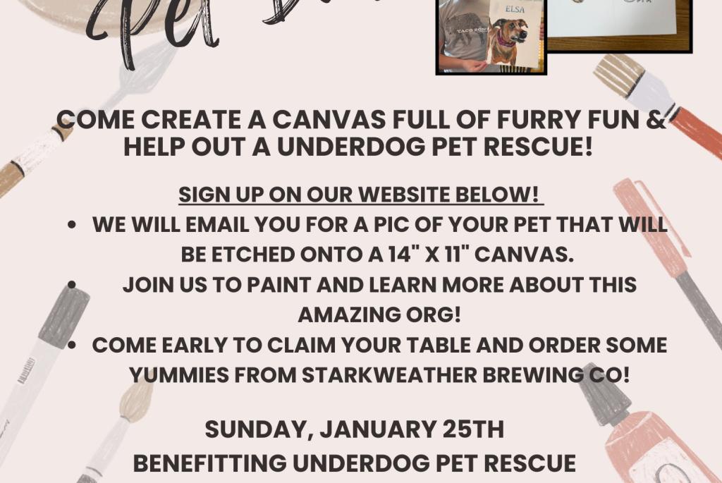 An art instructor will guide you through the steps. Art supplies provided acrylic paint, watercolors, and markers using any or all combinations. You create a pet inspired masterpiece, knowing a donation is being made to Underdog Pet Rescue.Register today to Paint Your Pet. Must pre-register, to ensure your pet's picture is on the canvas