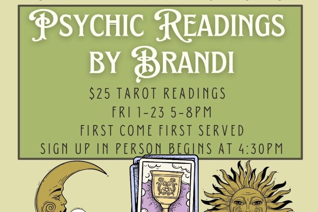 Unlock Your Inner Mysteries! Join us for a night of insight and inspiration with Psychic Tarot Card Readings by Brandi, Only $25 for a 15-minute reading. Sign-Up Begins: 4:30 PM first come, first served.