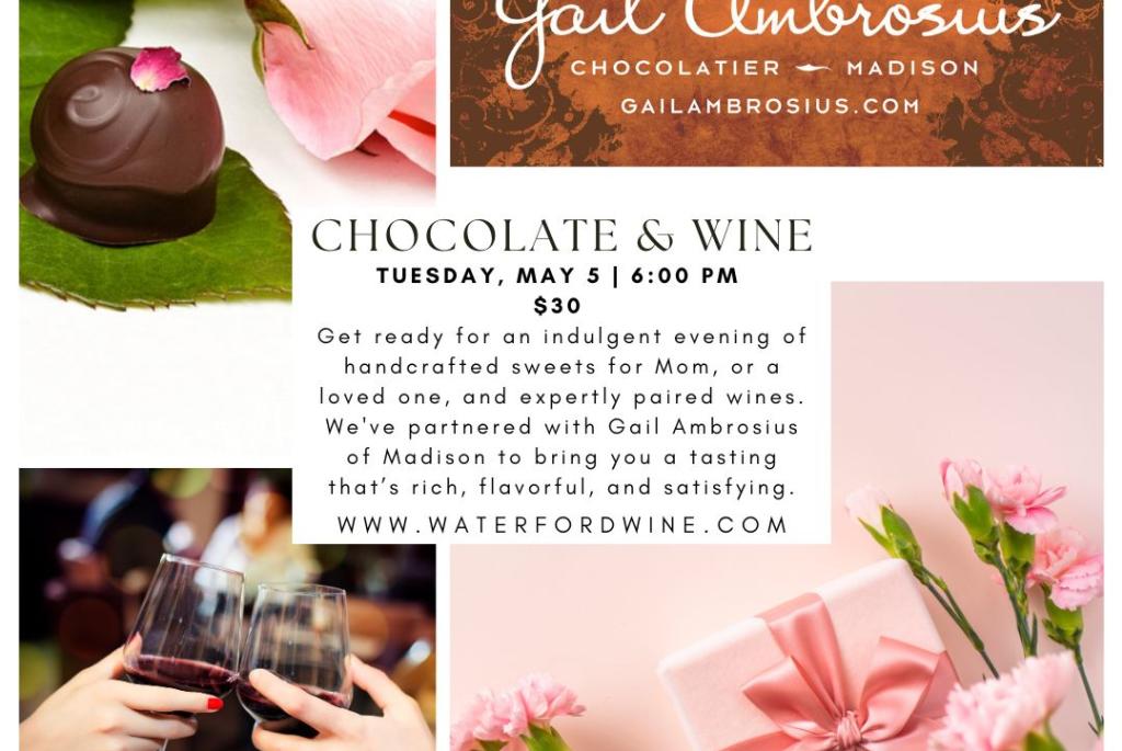 Join us for an indulgent evening at Waterford Wine & Spirits as we pair exquisite wines with handcrafted chocolates from Madison’s own Gail Ambrosius.