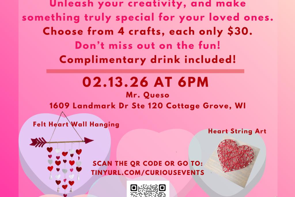 This event is hosted by The Curious Crafter and will be held at Mr. Queso (1609 Landmark Dr Ste 120. Cottage Grove, WI) on February 13th at 6PM